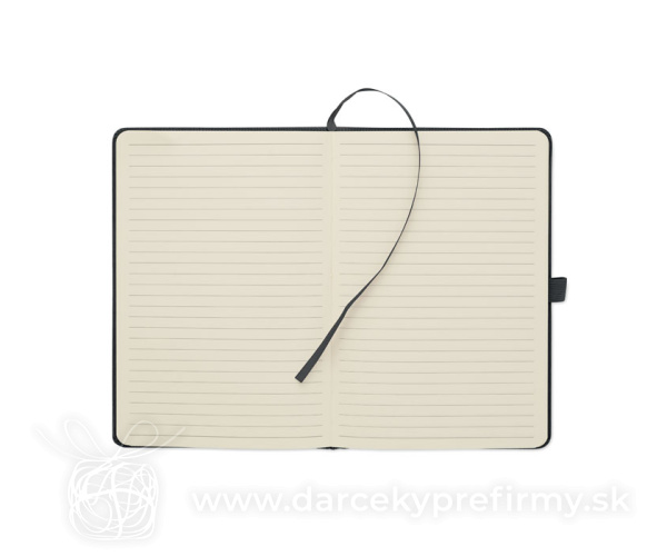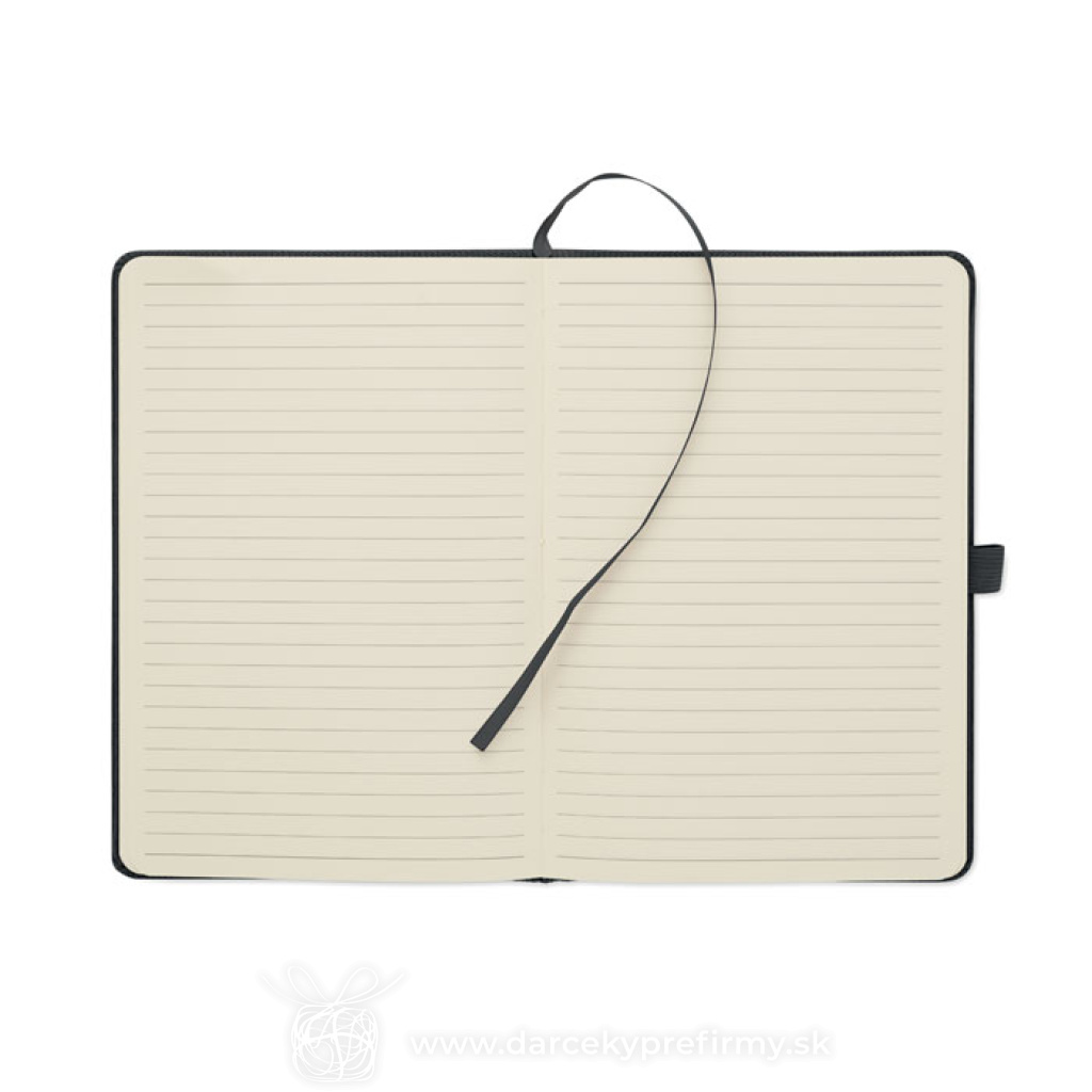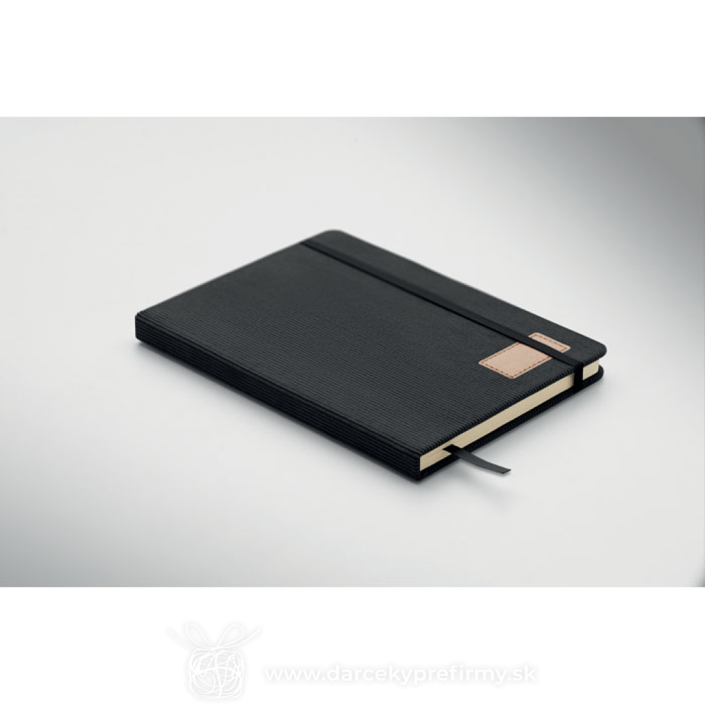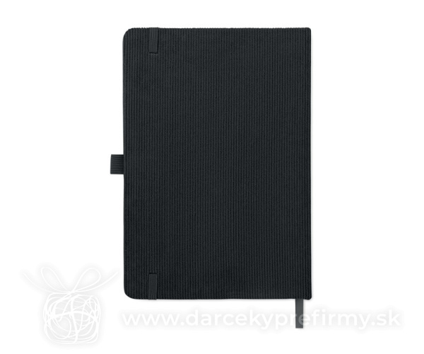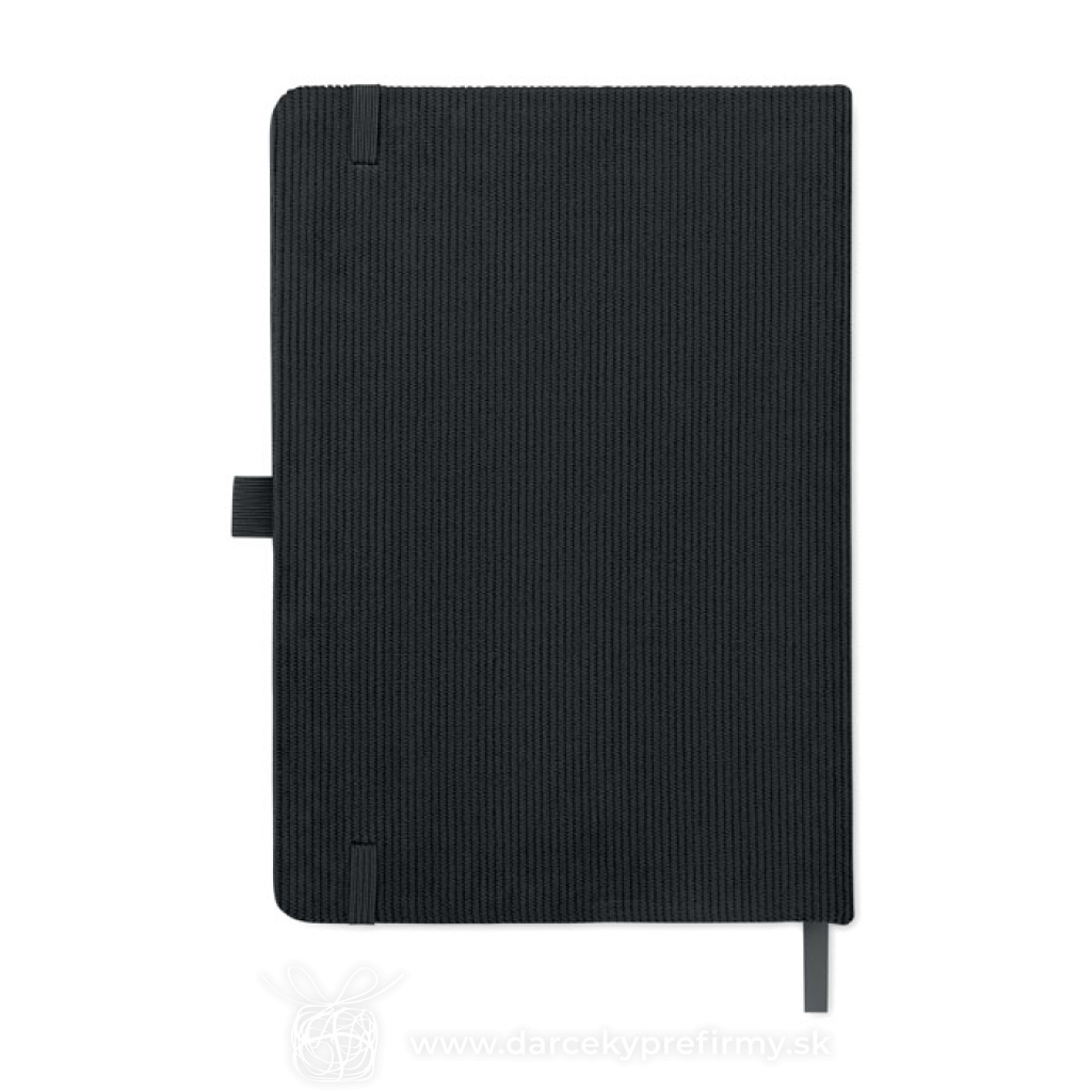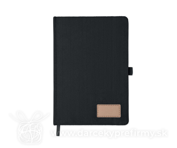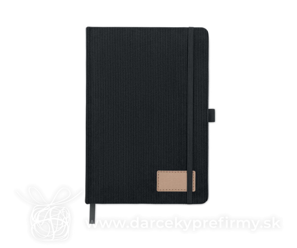 Zápisník A5 s tvrdými deskami potaženými polyesterovým RPET manšestrom. 192 linkovaných stránok z recyklovaného 70g papiera. Zavírání na gumičku, poutko na pero, záložka a etiketa z kraftového papiera.