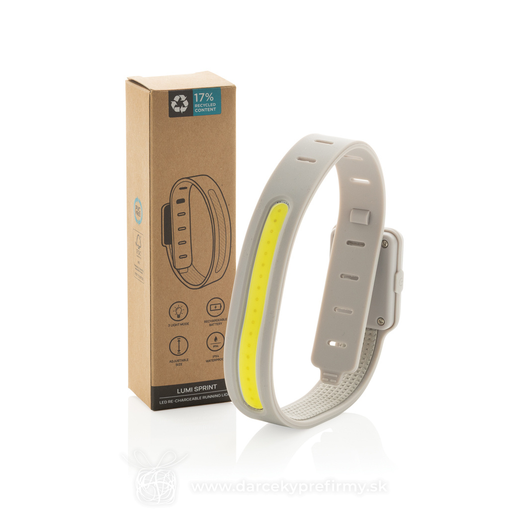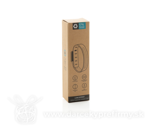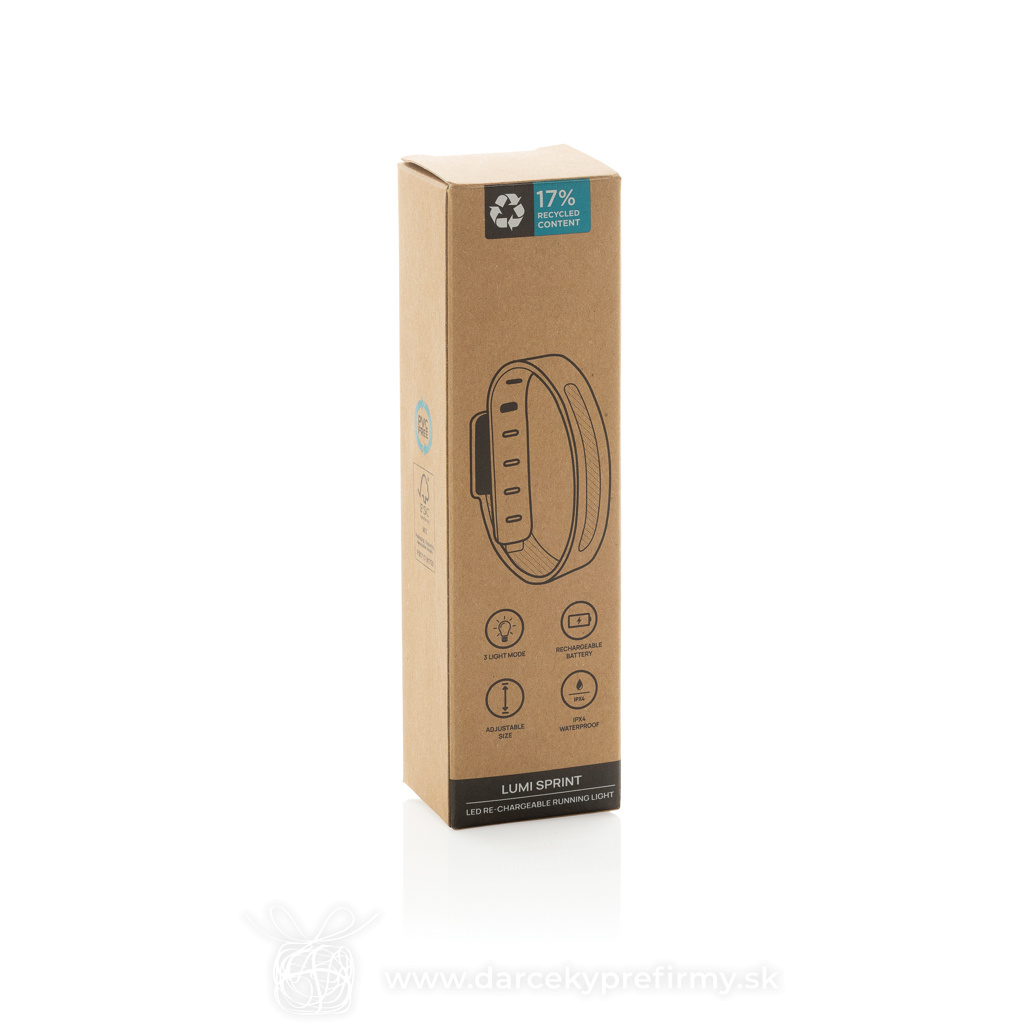 Lumi Sprint nabíjateľné bežecké LED svetlo z rec. RCS plastu Lumi Sprint LED nabíjateľné bežecké svetlo je ideálnym spoločníkom pre bezpečný a udržateľný beh v noci. S elegantným sivým dizajnom a hmotnosťou iba 39,6 gramov sa toto ultratenké svetlo ľahko pripevní na vašu ruku a drží pevne na mieste. Vďaka 90-lumenovej COB LED poskytuje silné osvetlenie a ponúka tri svetelné režimy: biele, červené a blikajúce bielo-červené, čím zaisťuje výbornú viditeľnosť. Zhotovené z pevnej a vodotesnej konštrukcie (IPX4), odolnej voči dažďu aj potu. Puzdro je vyrobené z recyklovaného plastu ABS s certifikáciou RCS. RCS (Recycled Claim Standard) je norma na overenie recyklovaného obsahu produktu v rámci celého dodávateľského reťazca. Celkový rec. obsah: 17 % na základe celkovej hmotnosti položky. Nabíjateľná 400mAh Li-Ion batéria poskytuje až 2 hodiny prevádzky a plne sa nabije len za 1,25 hodiny pomocou priloženého nabíjacieho kábla TPE USB-C s certifikáciou RCS. Balenie je z kraftového papiera bez obsahu PVC a s certifikátom FSC. Balené v balení FSC® mix. 7,39 € (bez DPH) Rýchla objednávka Chcem poradiť Dostupnosť: Skladom do 48hod. 343 ks Rozmery: 38,9 x 3,5 x 1,5 cm Materiál: Recyklovaná ABS, Silikón Váha: 46,7g Potlač: tento predmet vieme potlačiť Vaším logom. Ohľadne ceny a technológie potlače, vrátane grafického návrhu s Vaším logom/textom nám prosím pošlite dopyt na info@darcekyprefirmy.sk Polia označené * sú povinné a musia byť vyplnené. Meno a Priezvisko (povinné pole) Firma (povinné pole) Email (povinné pole) Telefón Predpokladané odberné množstvo Správa (povinné pole) Odoslaním formulára súhlasíte so spracovaním osobných údajov Odoslať Odoslať Polia označené * sú povinné a musia byť vyplnené. Meno a Priezvisko (povinné pole) Firma (povinné pole) Email (povinné pole) Telefón Správa (povinné pole) Odoslaním formulára súhlasíte so spracovaním osobných údajov Odoslať Odoslať Mohlo by vás zaujímať Predchádzajúci slajd Následujúci slajd Latto - baterka 1,55 € (cena bez DPH) PIANTI - Bambusová svítilna na klíče 1,26 € (cena bez DPH) Alurex - baterka 2,33 € (cena bez DPH)