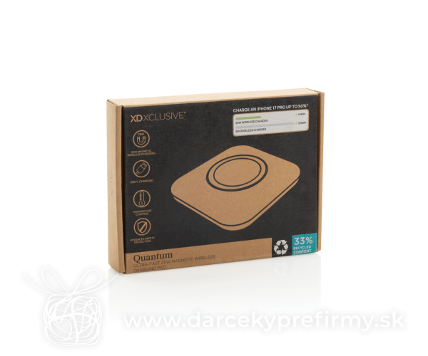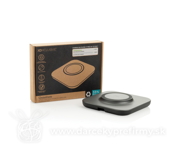 Quantum ultra-rýchla 25W magnet. Bezdrôt. nabíjacia podložka "Quantum prináša superrýchle 25 W magnetické bezdrôtové nabíjanie, navrhnuté pre výnimočne vysoký výkon a širokú kompatibilitu zariadení. Vďaka mimoriadne efektívnemu systému sa vaše zariadenia nabíjajú rýchlo a spoľahlivo pri každom použití.USB-C vstup zabezpečuje stabilný a konzistentný prívod energie pre optimálny 25 W výkon. Vyrobená z RCS certifikovaného recyklovaného ABS plastu s celkovým podielom recyklovaných materiálov 66 % (z celkovej hmotnosti produktu). Súčasťou balenia je 120 cm kábel z recyklovaného TPE s certifikáciou RCS. Produkt aj príslušenstvo sú 100 % bez PVC a balené v FSC® mix kraftovom obale.Minimálny vstup: 9 V / 3 A pre optimálne fungovanie." 21,11 € (bez DPH) Rýchla objednávka Chcem poradiť Dostupnosť: Nie je skladom Rozmery: 10 x 10 x 1,9 cm Materiál: rPC, Recyklované ABS Váha: 120g Potlač: tento predmet vieme potlačiť Vaším logom. Ohľadne ceny a technológie potlače, vrátane grafického návrhu s Vaším logom/textom nám prosím pošlite dopyt na info@darcekyprefirmy.sk Polia označené * sú povinné a musia byť vyplnené. Meno a Priezvisko (povinné pole) Firma (povinné pole) Email (povinné pole) Telefón Predpokladané odberné množstvo Správa (povinné pole) Odoslaním formulára súhlasíte so spracovaním osobných údajov Odoslať Odoslať Polia označené * sú povinné a musia byť vyplnené. Meno a Priezvisko (povinné pole) Firma (povinné pole) Email (povinné pole) Telefón Správa (povinné pole) Odoslaním formulára súhlasíte so spracovaním osobných údajov Odoslať Odoslať Mohlo by vás zaujímať Predchádzajúci slajd Následujúci slajd Bezdrôtový stojanček Ontario 10W z bambusu a RCS rABS 24,86 € (cena bez DPH) Magnetický bezdrôtový nabíjací stojan Magcharge 15W 24,86 € (cena bez DPH) Magnetická bezdrôtová nabíjačka 3v1 Swiss Peak 15W z RCS PU 43,41 € (cena bez DPH)