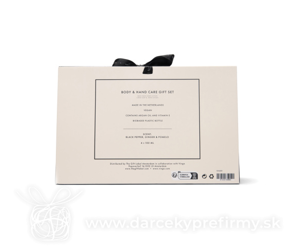 VINGA x TGL darčeková sada starostlivosti o telo a ruky Doprajte si starostlivosť o telo, ruky aj myseľ. Táto voňavá sada obsahuje štyri 100 ml fľaštičky: sprchový gél, telové mlieko, tekuté mydlo a krém na ruky. S hrejivou, sviežou arómou čierneho korenia, zázvoru a pomela poteší zmysly a dodá kúpeľni elegantný vzhľad. Balené v darčekovej obálke v krémovo-bielej a čiernej farbe. 36,05 € (bez DPH) Rýchla objednávka Chcem poradiť Dostupnosť: Skladom do 48hod. 1929 ks Rozmery: 29 x 9 x 19 cm Váha: 492,5g Potlač: tento predmet vieme potlačiť Vaším logom. Ohľadne ceny a technológie potlače, vrátane grafického návrhu s Vaším logom/textom nám prosím pošlite dopyt na info@darcekyprefirmy.sk Polia označené * sú povinné a musia byť vyplnené. Meno a Priezvisko (povinné pole) Firma (povinné pole) Email (povinné pole) Telefón Predpokladané odberné množstvo Správa (povinné pole) Odoslaním formulára súhlasíte so spracovaním osobných údajov Odoslať Odoslať Polia označené * sú povinné a musia byť vyplnené. Meno a Priezvisko (povinné pole) Firma (povinné pole) Email (povinné pole) Telefón Správa (povinné pole) Odoslaním formulára súhlasíte so spracovaním osobných údajov Odoslať Odoslať Mohlo by vás zaujímať Predchádzajúci slajd Následujúci slajd PitHeat Ear - vankúšik s čerešňovými kôstkami 5,85 € (cena bez DPH) Glaffy - osobná váha 9,32 € (cena bez DPH) KAORI - Domácí aroma difůzer 15,37 € (cena bez DPH)