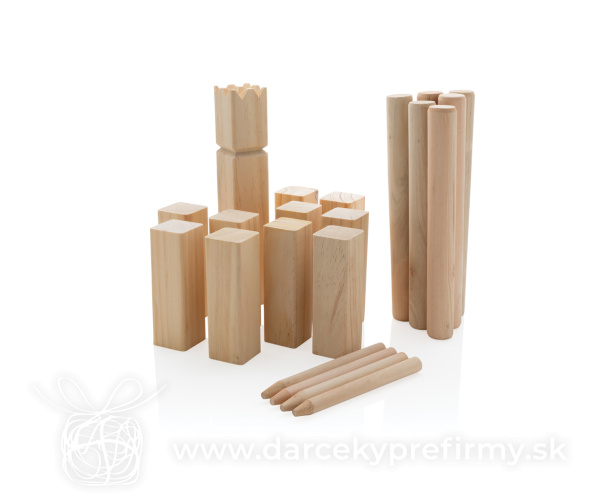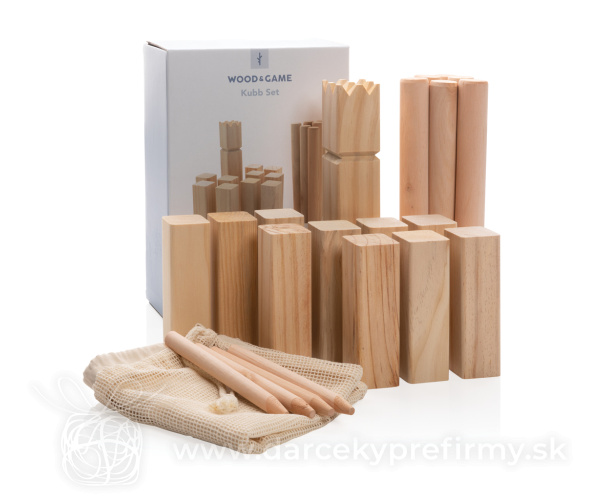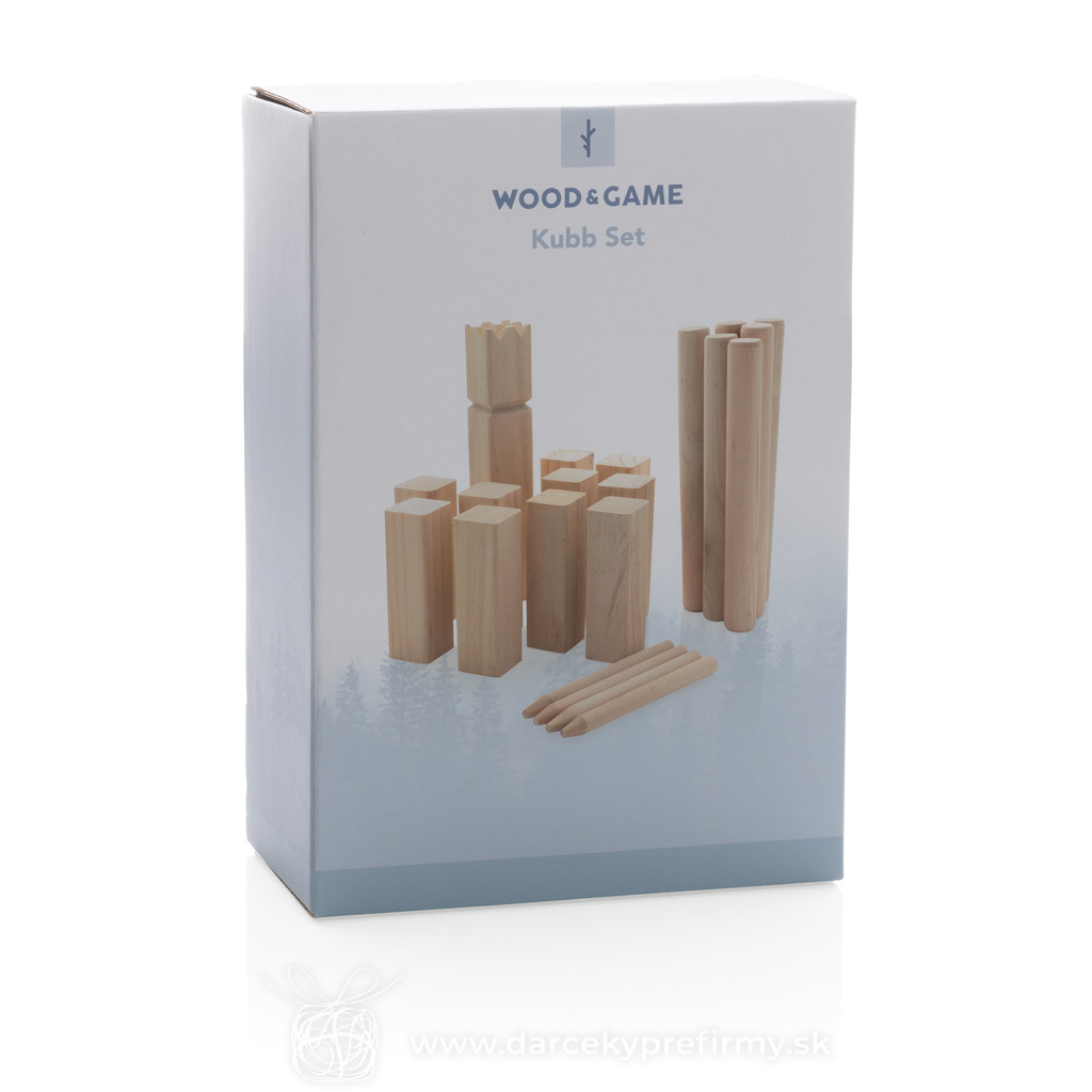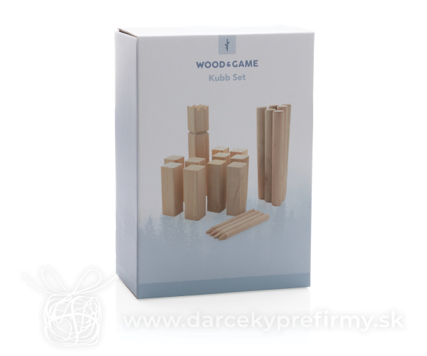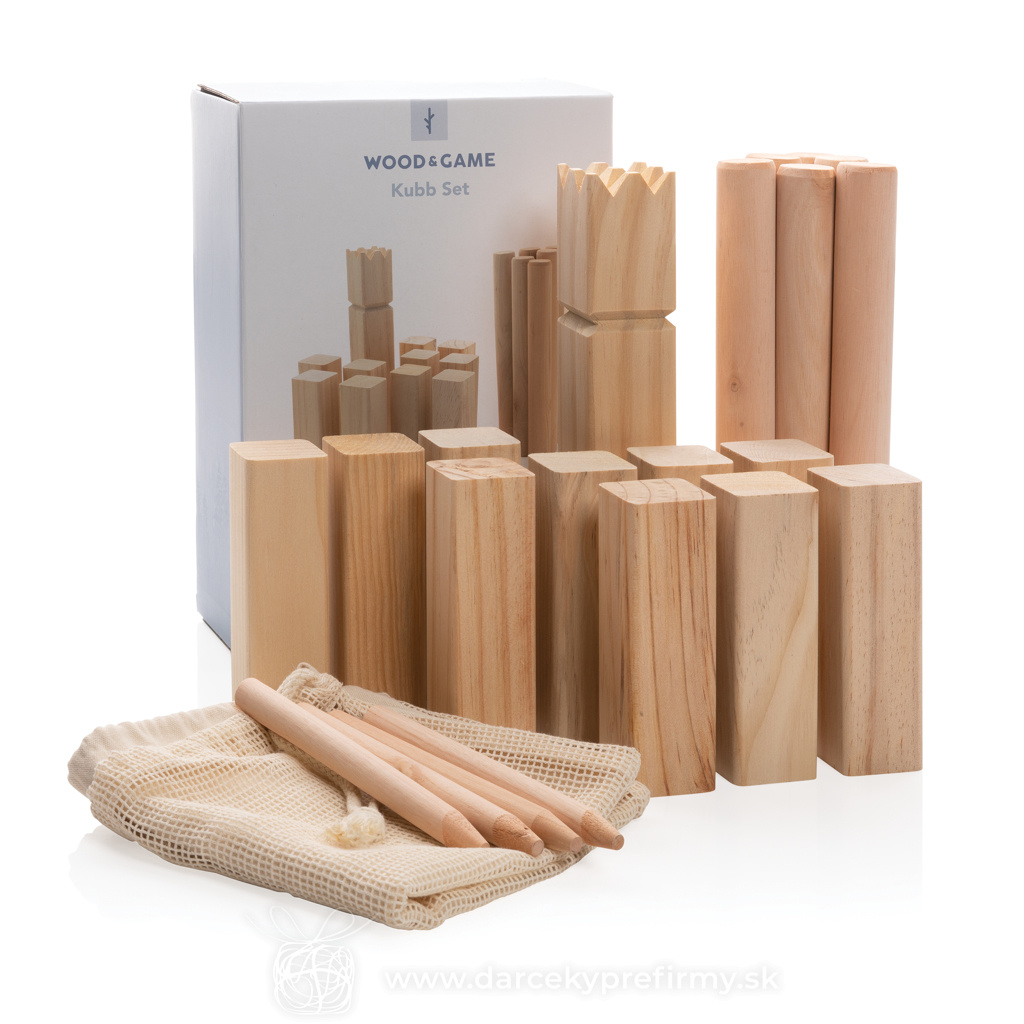 Herná sada Kubb z dreva Kubb je spoločenská vonkajšia hra pre dva tímy. Obľúbená je predovšetkým v severských krajinách, z ktorých sa postupne šíri do celého sveta. Jeden tím tvorí 1 až 6 členov a môže hrať prakticky ktokoľvek - od detí až po seniorov. Cieľom je zhodiť 5 súperových kubbov (rytierov) rozmiestnených vedľa seba pomocou hádzacích kolíkov. Hracie pole vyznačte jednoducho pomocou 4 kolíkov, ktoré umiestnite do rohov poľa. Kráľ je umiestnený doprostred poľa a padnúť musí ako posledný. Sada obsahuje: 1 kráľa, 10 kubbov, 6 hádzacích kolíkov a 4 kolíky na vyznačenie pole. Vyrobené z borovicového dreva (kráľ a kubby) a eukalyptového dreva (hádzací a rohové kolíky). Vrátane bavlneného vrecka a pravidiel hry. 30,96 € (bez DPH) Rýchla objednávka Chcem poradiť Dostupnosť: Skladom do 48hod. 1380 ks Rozmery: 32,5 x 34 x 1 cm Materiál: Drevo Váha: 1700g Potlač: tento predmet vieme potlačiť Vaším logom. Ohľadne ceny a technológie potlače, vrátane grafického návrhu s Vaším logom/textom nám prosím pošlite dopyt na info@darcekyprefirmy.sk Polia označené * sú povinné a musia byť vyplnené. Meno a Priezvisko (povinné pole) Firma (povinné pole) Email (povinné pole) Telefón Predpokladané odberné množstvo Správa (povinné pole) Odoslaním formulára súhlasíte so spracovaním osobných údajov Odoslať Odoslať Polia označené * sú povinné a musia byť vyplnené. Meno a Priezvisko (povinné pole) Firma (povinné pole) Email (povinné pole) Telefón Správa (povinné pole) Odoslaním formulára súhlasíte so spracovaním osobných údajov Odoslať Odoslať Mohlo by vás zaujímať Predchádzajúci slajd Následujúci slajd Corsano - elektrický vetráčik 4,79 € (cena bez DPH) MINI MATCH - Plážový tenisový set 2,77 € (cena bez DPH) FUNBALL - Gumový skákací míč 1,43 € (cena bez DPH)