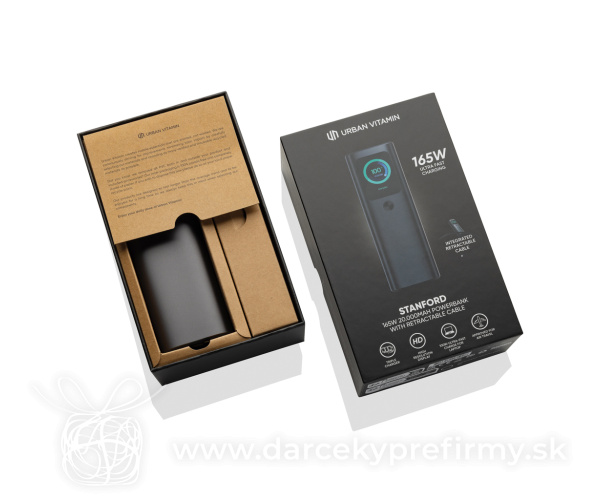 Powerbanka Urban Vitamin Stanford 165W 20 000 mAh Powerbanka Urban Vitamin Stanford je vrcholom pokročilej nabíjacej technológie, ktorá ponúka bezkonkurenčný výkon pre tých, ktorí požadujú to najlepšie. S kapacitou 20 000 mAh podporuje Stanford ohromujúcich 165W rýchlonabíjanie, ktoré zabezpečí, že vaše zariadenia, vrátane viacerých notebookov a MacBookov, budú nabíjané súčasne a bleskovou rýchlosťou.Je vybavená tromi výstupnými portami: dvomi USB-C a jedným USB-A, čo ju robí mimoriadne všestrannou. Okrem toho ponúka unikátny integrovaný 70 cm zasúvací USB-C rýchlonabíjací kábel s výkonom až 100W, čím znižuje potrebu nosiť ďalšie príslušenstvo.Vysoce kvalitný TFT farebný displej poskytuje aktuálne informácie o rýchlosti nabíjania a stave zariadenia, takže ste počas nabíjania vždy informovaní. S odolným hliníkovým telom Stanford ponúka prémiový vzhľad a pocit, pričom si zachováva ľahký a prenosný dizajn. Produkty Urban Vitamin sú vyrobené bez PVC a balené v obaloch so zníženým obsahom plastov. 93,18 € (bez DPH) Rýchla objednávka Chcem poradiť Dostupnosť: Skladom do 48hod. 1376 ks Rozmery: 15,6 x 5,3 x 4,1 cm Materiál: Hliník, ABS Váha: 517,3g Potlač: tento predmet vieme potlačiť Vaším logom. Ohľadne ceny a technológie potlače, vrátane grafického návrhu s Vaším logom/textom nám prosím pošlite dopyt na info@darcekyprefirmy.sk Polia označené * sú povinné a musia byť vyplnené. Meno a Priezvisko (povinné pole) Firma (povinné pole) Email (povinné pole) Telefón Predpokladané odberné množstvo Správa (povinné pole) Odoslaním formulára súhlasíte so spracovaním osobných údajov Odoslať Odoslať Polia označené * sú povinné a musia byť vyplnené. Meno a Priezvisko (povinné pole) Firma (povinné pole) Email (povinné pole) Telefón Správa (povinné pole) Odoslaním formulára súhlasíte so spracovaním osobných údajov Odoslať Odoslať Mohlo by vás zaujímať Predchádzajúci slajd Následujúci slajd Univerzálna nabíjačka 5v1 65W 15000mAh Urban Vitamin Oxnard 110,63 € (cena bez DPH) Urban Vitamin Campbell 55W 10 000 mAh vrecková powerbanka 49,72 € (cena bez DPH) Powerbanka 5 000 mAh z bambusu 19,80 € (cena bez DPH)