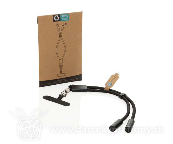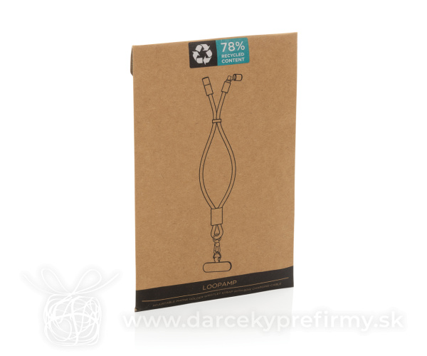 LoopAmp nastaviteľné pútko na telefón z RCS RPET 60W káblom Predstavujeme LoopAmp, telefónny kábel vyrobený z RCS certifikovaného RPET. RCS (Recycled Claim Standard) je štandard na overenie recyklovaného obsahu produktu v celom dodávateľskom reťazci. Celkový recyklovaný obsah: 78 % na základe celkovej hmotnosti položky. Navrhnutý ako prémiový zápästný popruh, jeho vysokokvalitný lanyard pohodlne obopína zápästie a presne vyrobený spojovací krúžok a hák chránia pred náhodným spadnutím – ideálne pre pohodlné používanie počas každodenných ciest, cvičení alebo rýchlej chôdze. LoopAmp slúži aj ako USB-C nabíjací kábel s až 60 W rýchlonabíjacou kapacitou. Efektívne nabíjajte svoj smartfón, tablet alebo notebook s vysokou účinnosťou vďaka zosilneným konektorom a ultraodolným materiálom navrhnutým pre spoľahlivý každodenný výkon. Podporuje prenos dát. Bez PVC a balené v FSC obale. 7,39 € (bez DPH) Rýchla objednávka Chcem poradiť Dostupnosť: Skladom do 48hod. 6366 ks Rozmery: 46 x 1 cm Materiál: Recyklované TPE, rPET Váha: 33g Potlač: tento predmet vieme potlačiť Vaším logom. Ohľadne ceny a technológie potlače, vrátane grafického návrhu s Vaším logom/textom nám prosím pošlite dopyt na info@darcekyprefirmy.sk Polia označené * sú povinné a musia byť vyplnené. Meno a Priezvisko (povinné pole) Firma (povinné pole) Email (povinné pole) Telefón Predpokladané odberné množstvo Správa (povinné pole) Odoslaním formulára súhlasíte so spracovaním osobných údajov Odoslať Odoslať Polia označené * sú povinné a musia byť vyplnené. Meno a Priezvisko (povinné pole) Firma (povinné pole) Email (povinné pole) Telefón Správa (povinné pole) Odoslaním formulára súhlasíte so spracovaním osobných údajov Odoslať Odoslať Mohlo by vás zaujímať Predchádzajúci slajd Následujúci slajd Nila - puzdro na mobil 0,15 € (cena bez DPH) Magnetický držiak telefónu Terra Magnetic z RCS plastu 6,16 € (cena bez DPH) Torla - stojan na mobil 0,31 € (cena bez DPH)
