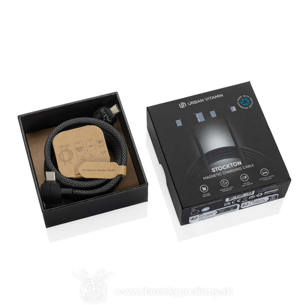 Magnetický kábel Urban Vitamin Stockton 65W z rec. TPE/PET Ďaľšie varianty 16,06 € Kvalitný 120 cm magnetický nabíjací a dátový kábel. Rozlúčte sa so zamotanými káblami. Magnetické prevedenie zabraňuje zamotávaniu a uľahčuje organizáciu. USB C aj USB A vstupy umožňujú pripojenie na akýkoľvek zdroj. Výstupy pre iOS aj USB C zaisťujú kompatibilitu naprieč zariadeniami. Vysoký výkon 65W umožňuje nabíjanie aj notebookov. Vhodný aj na prenos dát. Vyrobený z recyklovaného ABS s certifikáciou RCS (Recycled Claim Standard). Celkový podiel recyklátu podľa váhy produktu: 30%. Produkt aj príslušenstvo bez PVC. Balené v darčekovom balení Urban Vitamin s minimálnym obsahom plastov. 16,06 € (bez DPH) Rýchla objednávka Chcem poradiť Dostupnosť: Skladom do 48hod. 7872 ks Rozmery: 125 x 3,9 x 0,8 cm Materiál: Recyklovaná TPE, rPET Váha: 63,6g Potlač: tento predmet vieme potlačiť Vaším logom. Ohľadne ceny a technológie potlače, vrátane grafického návrhu s Vaším logom/textom nám prosím pošlite dopyt na info@darcekyprefirmy.sk Polia označené * sú povinné a musia byť vyplnené. Meno a Priezvisko (povinné pole) Firma (povinné pole) Email (povinné pole) Telefón Predpokladané odberné množstvo Správa (povinné pole) Odoslaním formulára súhlasíte so spracovaním osobných údajov Odoslať Odoslať Polia označené * sú povinné a musia byť vyplnené. Meno a Priezvisko (povinné pole) Firma (povinné pole) Email (povinné pole) Telefón Správa (povinné pole) Odoslaním formulára súhlasíte so spracovaním osobných údajov Odoslať Odoslať Mohlo by vás zaujímať Predchádzajúci slajd Následujúci slajd CABLONG - Dlouhý nabíjací kábel 2 v 1 4,10 € (cena bez DPH) Blinka - kryt na webkameru 0,12 € (cena bez DPH) CURVY C - Nabíjecí bezdrátová myš 7,02 € (cena bez DPH)