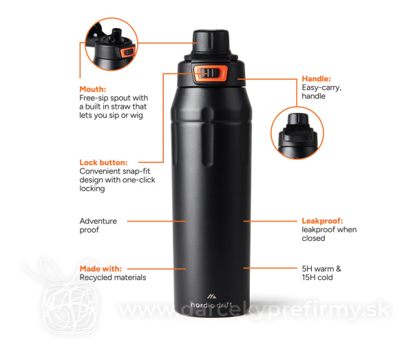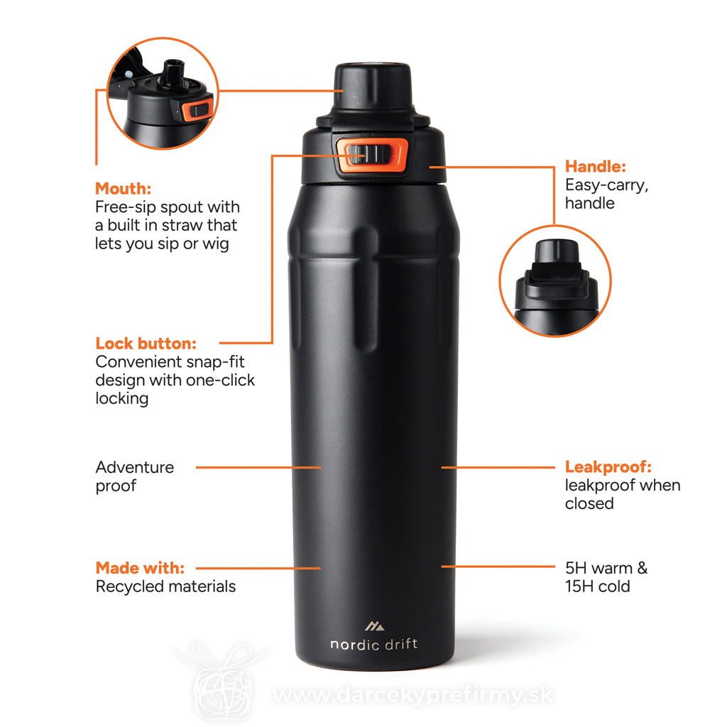 Nordic Drift Trail RCS Izolovaná uzamykateľná športová fľaša Vyrobený pre trvácnosť, Stvorený pre dobrodružstvo.Zoznámte sa s recyklovanou oceľovou fľašou Nordic Drift, vyrobenou zo 79 % certifikovanej recyklovanej nehrdzavejúcej ocele (RCS). Navrhnutá pre dobrodružstvá s objemom 750 ml, ponúka odolné práškové lakovanie, rukoväť a uzamykateľné viečko, ktoré udrží váš nápoj v bezpečí. Inovatívne viečko ponúka dve možnosti pitia – jednoducho otočte medzi funkciou hltu a funkciou dúšku pre jednoduchú hydratáciu na cestách. Nepriepustná, praktická a ekologická fľaša vhodná na každodenné použitie aj vonkajšie aktivity. Dodáva sa v darčekovej krabičke FSC®.Všetky produkty Nordic Drift sú testované na kvalitu. Pretože pevne veríme vo výkonnosť a trvácnosť našich výrobkov, každý produkt je krytý 5-ročnou zárukou na výrobné chyby. 23,60 € (bez DPH) Rýchla objednávka Chcem poradiť Dostupnosť: Skladom do 48hod. 3128 ks Rozmery: 27,5 x ø 7,9 cm Materiál: Recyklovaná nehrdzavejúca oceľ, PP Váha: 403g Potlač: tento predmet vieme potlačiť Vaším logom. Ohľadne ceny a technológie potlače, vrátane grafického návrhu s Vaším logom/textom nám prosím pošlite dopyt na info@darcekyprefirmy.sk Polia označené * sú povinné a musia byť vyplnené. Meno a Priezvisko (povinné pole) Firma (povinné pole) Email (povinné pole) Telefón Predpokladané odberné množstvo Správa (povinné pole) Odoslaním formulára súhlasíte so spracovaním osobných údajov Odoslať Odoslať Polia označené * sú povinné a musia byť vyplnené. Meno a Priezvisko (povinné pole) Firma (povinné pole) Email (povinné pole) Telefón Správa (povinné pole) Odoslaním formulára súhlasíte so spracovaním osobných údajov Odoslať Odoslať Mohlo by vás zaujímať Predchádzajúci slajd Následujúci slajd Peppy - termo hrnček 3,07 € (cena bez DPH) Termo fľaša Gaia z RCS recyklovanej nerezovej ocele 12,51 € (cena bez DPH) POLE - Láhev s dotykovým teploměrem 8,29 € (cena bez DPH)