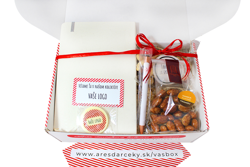 VAŠA KRABICA S POTLAČOU SO ZÁPISNÍKOM NÁŠ TIP Celoplošne potlačená krabica s vašou grafikou - či už vianočne, alebo ako "uvítací box" pre nového zamestnanca. V tomto boxe je započítaná potlač bieleho zápisníka. Okrem zápisníka sme pridali chutné delikatesy, ktoré potešia vašich zamestnancov či obchodných partnerov. 20,00 € (bez DPH) Rýchla objednávka Chcem poradiť Potlač: tento predmet vieme potlačiť Vaším logom. Ohľadne ceny a technológie potlače, vrátane grafického návrhu s Vaším logom/textom nám prosím pošlite dopyt na info@darcekyprefirmy.sk Informácie o VAŠA KRABICA S POTLAČOU SO ZÁPISNÍKOM zápisník A5, pevný obal, 144 čistých strán, krém.papier, rôzne farby, vrátane potlače loga 1farba zmes orechov 80gr (mandle, lieskovce, kešu) tiramisu mandle (v bielej, horkej čokoláde s kávou) čokokrúžok 8gr, 5cm, posýpka, s Vaším logom celoplošne potlačená krabička vo Vašom dizajne, kartička vnútri Pri vyšších odberoch individuálna zľava. Vyžiadajte si ponuku. Pre nižší ako min. odber platia upravené ceny (informujte sa). DARCEKYPREFIRMY_komplimentky_vzorkovnik_2025Objednávka krok po kroku Polia označené * sú povinné a musia byť vyplnené. Meno a Priezvisko (povinné pole) Firma (povinné pole) Email (povinné pole) Telefón Predpokladané odberné množstvo Správa (povinné pole) Odoslaním formulára súhlasíte so spracovaním osobných údajov Odoslať Odoslať Polia označené * sú povinné a musia byť vyplnené. Meno a Priezvisko (povinné pole) Firma (povinné pole) Email (povinné pole) Telefón Správa (povinné pole) Odoslaním formulára súhlasíte so spracovaním osobných údajov Odoslať Odoslať Mohlo by vás zaujímať Predchádzajúci slajd Následujúci slajd Čokoláda s Vaším logom 2,50 € (cena bez DPH) Etiketa s Vaším logom SLADKÉ ŠÉFOVE DELIKATESY 31,00 € (cena bez DPH) NOVINKA 2025 PRÍRODNÁ TAŠKA HVIEZDA 12,50 € (cena bez DPH) BESTSELLER
