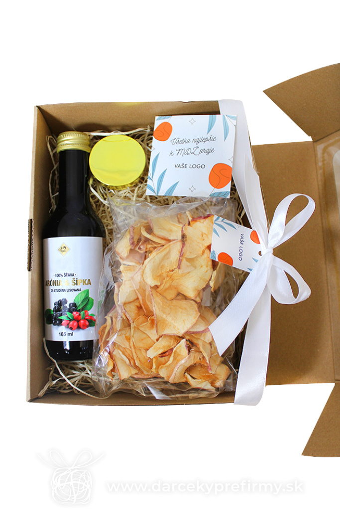 ZDRAVÝ BALÍČEK S BALZAMOM MDŽ BALENIA OD 20 KS Jednoduché balenie so zdravými produktami, doplnené o balzám na pery. Možné dodať aj v inej univerzálnejšej variácii. 12,00 € (bez DPH) Rýchla objednávka Chcem poradiť Dostupnosť: Minimálne odberné množstvo 20 Potlač: tento predmet vieme potlačiť Vaším logom. Ohľadne ceny a technológie potlače, vrátane grafického návrhu s Vaším logom/textom nám prosím pošlite dopyt na info@darcekyprefirmy.sk Informácie o ZDRAVÝ BALÍČEK S BALZAMOM sušené jablká (chrumkavé, sušené pri nízkej teplote), 40Gr 100% prírodná šťava rakytník/šípka, šípka/arónia, 185ml prírodný balzám so zrkadielkom vo viečku, kovový vzhľad, dermatologicky testované, SPF10,vôňa vanilka natur krabica s okienkom, výplňou a stuhou, rozmer 230 x 170 x 90 mm Pri vyšších odberoch individuálna zľava. Vyžiadajte si ponuku. Pre nižší ako min. odber platia upravené ceny (informujte sa). DARCEKYPREFIRMY_komplimentky_vzorkovnik_2025Objednávka krok po kroku Polia označené * sú povinné a musia byť vyplnené. Meno a Priezvisko (povinné pole) Firma (povinné pole) Email (povinné pole) Telefón Predpokladané odberné množstvo Správa (povinné pole) Odoslaním formulára súhlasíte so spracovaním osobných údajov Odoslať Odoslať Polia označené * sú povinné a musia byť vyplnené. Meno a Priezvisko (povinné pole) Firma (povinné pole) Email (povinné pole) Telefón Správa (povinné pole) Odoslaním formulára súhlasíte so spracovaním osobných údajov Odoslať Odoslať Mohlo by vás zaujímať Predchádzajúci slajd Následujúci slajd DÁMSKY MIX BALÍČEK 11,50 € (cena bez DPH) MDŽ BALENIA OD 20 KS Veselá vianočná krabička 18,20 € (cena bez DPH) WELLNESS V DENIMOVEJ TAŠTIČKE 12,50 € (cena bez DPH) MDŽ BALENIA OD 20 KS